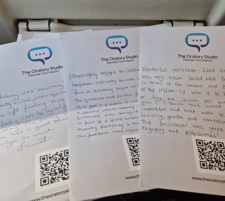 We focus on stage presence, voice coaching, presentation skills, storytelling, and developing leadership qualities - such as active listening, rapport building, leading the room and providing structured, actionable feedback.